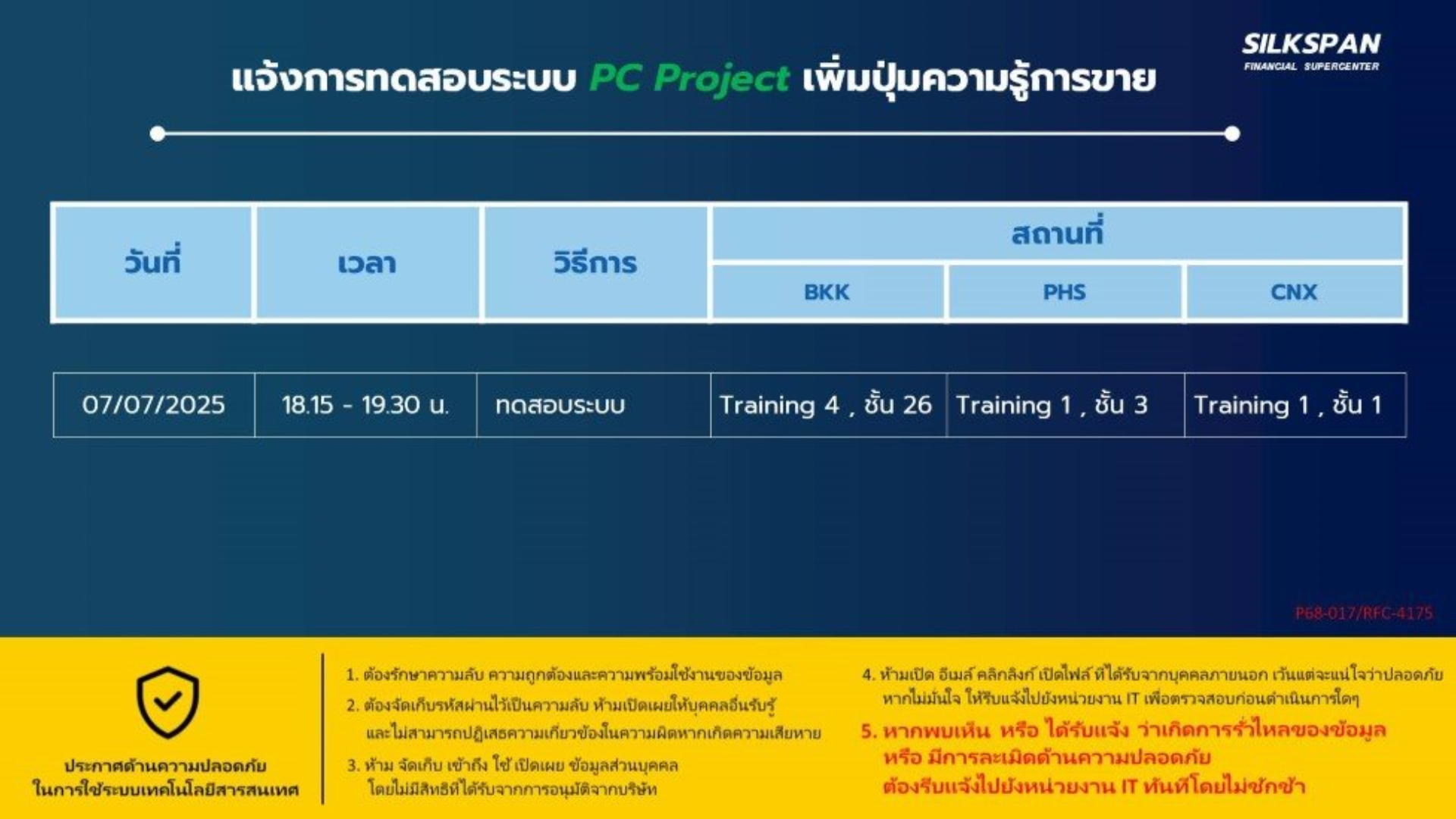 07ก.ค.2568 แจ้งการทดสอบระบบ PC Project เพิ่มปุ่มความรู้การขาย