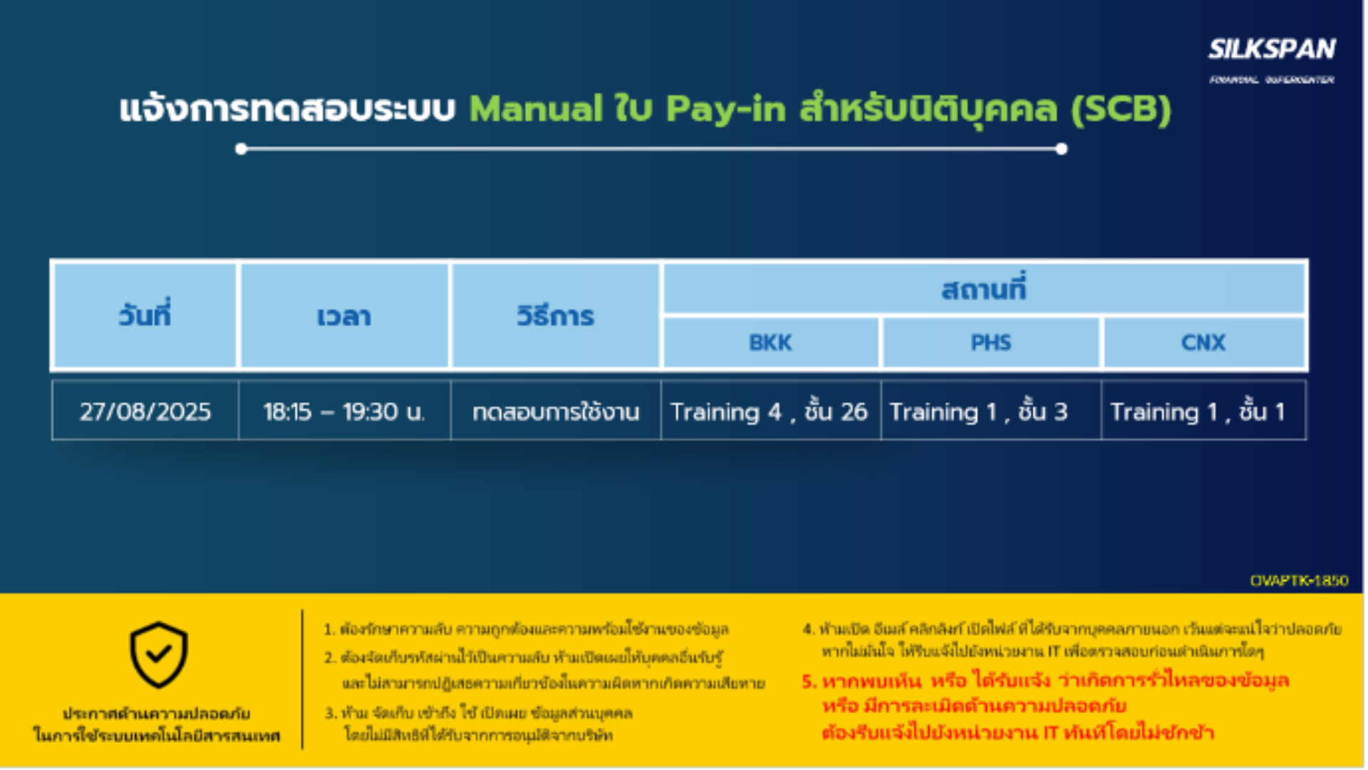 26 - 27 ส.ค. 2568 แจ้งทดสอบระบบ Manual ใบ Pay-in สำหรับนิติบุคคล (SCB)