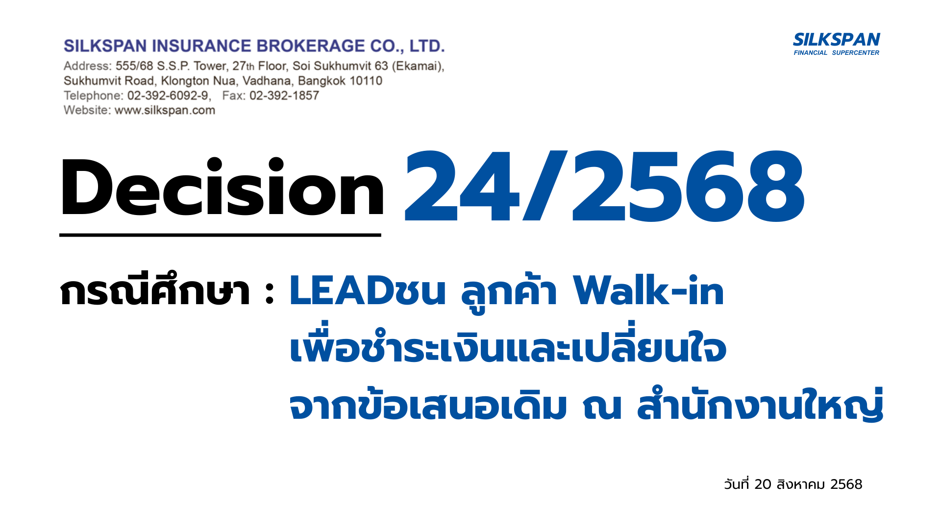 กรณีศึกษาที่ 24 เรื่อง : 20.08.2025_LEADชน ลูกค้า Walk-in เพื่อชำระเงินและเปลี่ยนใจจากข้อเสนอเดิม ณ สำนักงานใหญ่